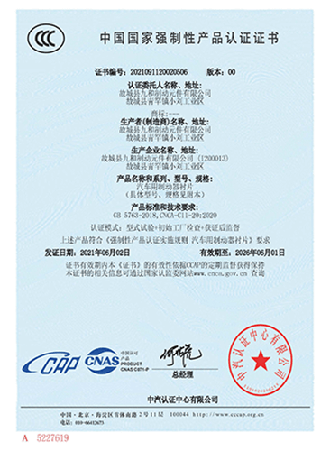 故城縣九和制動(dòng)元件有限公司主導(dǎo)產(chǎn)品為:汽車剎車片、裝載機(jī)剎車片。剎車片采用高溫高壓的熱壓工藝、設(shè)備、生產(chǎn)線、能保證質(zhì)量穩(wěn)定,有為主機(jī)廠配套生產(chǎn)的經(jīng)驗(yàn)和能力。劉如根商標(biāo)是公司主要商標(biāo),公司還有飛人標(biāo)牌、蛟龍牌、橫空出世等品牌!公司有多個(gè)剎車片檢驗(yàn)設(shè)備,剎車片摩擦性能定速摩擦試驗(yàn)機(jī)與國家非金屬礦制品檢驗(yàn)中心試驗(yàn)機(jī)是同公司生產(chǎn)的同型號(hào)試驗(yàn)機(jī)。拖曳試驗(yàn)機(jī)2020年通過中國建材檢驗(yàn)集團(tuán)咸陽有限公司檢驗(yàn)合格,剪切試驗(yàn)機(jī);布氏和洛氏試驗(yàn)機(jī)。2021年公司通過國家強(qiáng)制性CCC認(rèn)證、通過過19001-2000idt ISO 9001:2015質(zhì)量體系認(rèn)證,IATF16949認(rèn)證,歐盟Emark認(rèn)證。剎車片執(zhí)行GB/T11834-2011、GB 5763-2018標(biāo)準(zhǔn)。公司產(chǎn)品先后曾給山東臨工、徐工、卡特彼勒(山工)、徐州美馳車橋公司、肥城金城橋公司,山東路通橋箱科技公司,山東博士樂公司,郯城郯液公司,日照金···